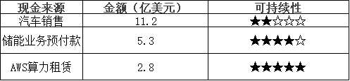 (上表为分析师对特斯拉现金流来源变化的估计,并非财报直接披露数据。特斯拉在汽车销售之外获得大量储能订单预付款,为现金流提供支持。同时有观点认为,特斯拉正尝试将其AI超算算力商业化,类似AWS对外租赁,这部分有望成为高可持续现金来源。不过这一“算力租赁”收入目前尚未在财报中明确列示。)