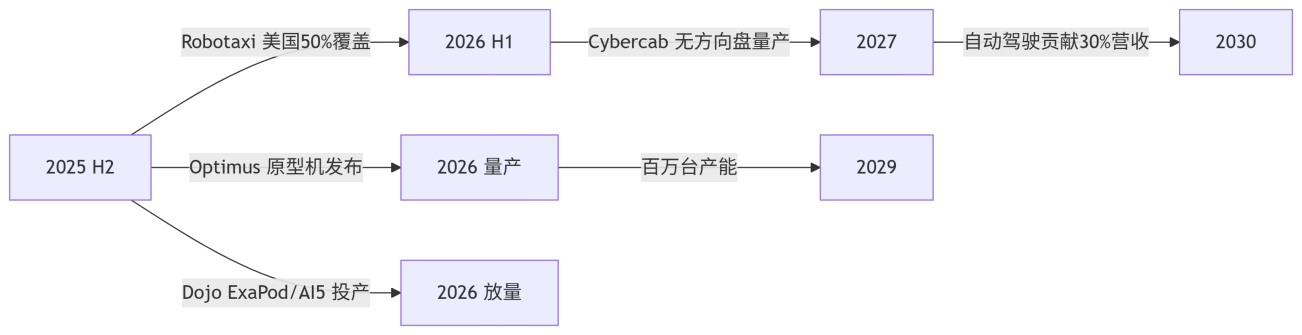 - 2026 Q3 :Robotaxi美国主要城市覆盖;AI5芯片商用