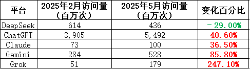 然而,当掌声逐渐消退时,质疑声便不可避免地浮出水面。DeepSeek的低价策略背后隐藏着明显的运营瓶颈和技术挑战。从平台流量来看,Web端访问量并未持续攀升,用户的转化率和留存率也持续承压,凸显出价格战无法长期维系用户黏性的现实。在用户体验和系统稳定性方面,DeepSeek虽然面临与高端模型同样的期待值,却未能在交付水平上同步跟进。