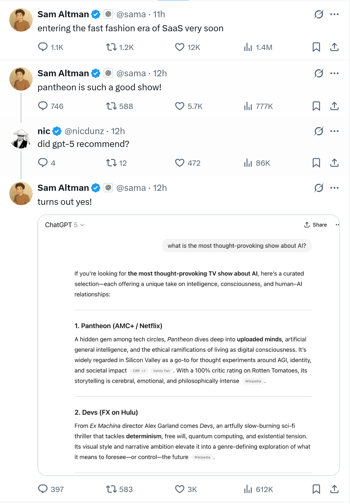 奥特曼特别提到,由此看来,GPT-5一旦问世将推动 SaaS 行业进入 “快时尚时代”——可类比快时尚产业的快速迭代逻辑,企业级软件将借助 AI 实现功能的高频更新与个性化适配,这一判断再次点燃市场对 AI 产业链的想象空间。