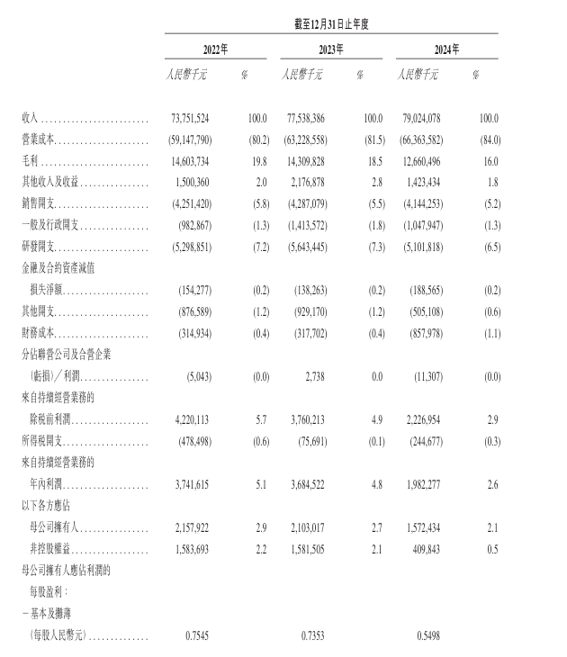 根据招股书披露,紫光股份 2022–2024 年营收分别约为 737.5 亿元、775.4 亿元、790.2 亿元,稳步增长。但 2024 年净利润降至 19.8 亿元,较前两年 36–37 亿元出现明显回落。