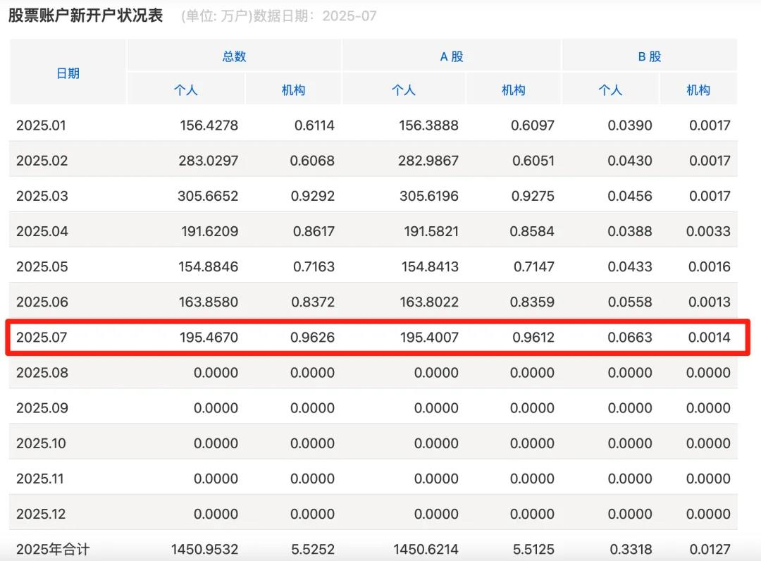消息面上,财政部发布的最新数据显示,今年前7个月,全国一般公共预算收入135839亿元,同比增长0.1%,年内首次转正,提振场内乐观情绪。其他利好方面,也有暖意融融之势。A股市场的火热,助燃了一批新投资者开户入市的狂潮。据上交所数据显示,今年7月A股新开户196.36万户,和6月的164.64万户相比,环比增加31.72万户,环比增幅近两成。如果改变一个统计周期的话,我们发现,年内新股民入市增速更为迅猛,截至7月31日,今年以来A股合计新开户数量为1456.13万户,与2024年前7月1063.79万开户数量相比,同比增长36.88%,在增量资金入市潮覆盖后,A股市场的活跃度得以全面提升。