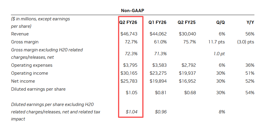 非GAAP每股收益1.05美元,超过市场预期(39名分析师此前平均预期英伟达第二财季每股收益将达1.01美元)。