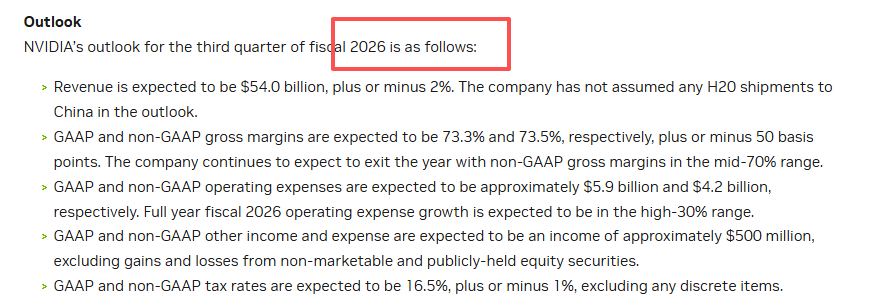 第三季度 预计营收540亿美元(±2%),毛利率73.3%–73.5%。但需注意该指引暂未纳入中国市场;7月底,媒体报道由于中国市场需求强劲,英伟达又向台积电下单了30万块H20芯片,将补充其现有的60万至70万块H20芯片库存;同时,结合电话会议披露的亮点 —— 若地缘政治问题缓解,第三季度有望向中国发运H20,且公司具备承接更多订单的履约能力——若后续将中国区域的H20、B30纳入营收,综合预计能为整体营收增加15%左右,届时总营收有望达到650亿美元左右。值得关注的是,电话会议中还提及中国市场今年对英伟达约有500亿美元的机会,若公司能用有竞争力的产品覆盖这一市场,按当前趋势,全年营收也有望实现50%左右的增速。