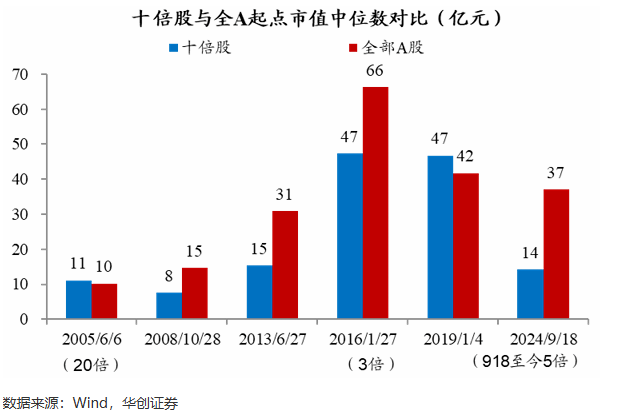本轮行情中,大多数五倍股起始市值处在全A最小的20%分位区间内,中位数14亿元。这和此前的历史的一般经验相符,其实不管是五倍股,还是十倍股,股价的上涨最终都会直接体现为市值的增长。而起步阶段的小市值,预示着能提供充足的成长空间,也更有机会获得灵活场外资金的青睐。这里有必要提醒一下,市值小,只是代表股价波动更灵活,却不是股价涨跌的必要条件,更不是影响价格的核心因素了。