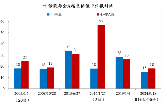 事实上,股价在指数系统性行情下,上涨1倍还是3倍,取决于后续业绩与市场情绪,以及业绩表现的综合博弈结果。而如果本身估值便宜,至少可以让投资者理论上具备一定的折价先发优势。但能“买在无人问津处”的智者,又有几人呢?事实上,本轮行情演变至今所跑出的100只五倍股,估值在起步阶段就处全A 20%以下分位的占比,已经接近三分之一;绝对值看,本轮五倍股起始PE中位数(15倍)也低于全A的“18倍”。估值水平低廉,意味着投资者入市的系统性风险系数相对较小,客观上会给市场传递“股价被低估”的信号。而在行情加速后,一旦业绩予以配合,更容易吸引机构资金的配置力量。