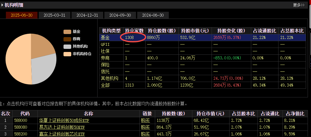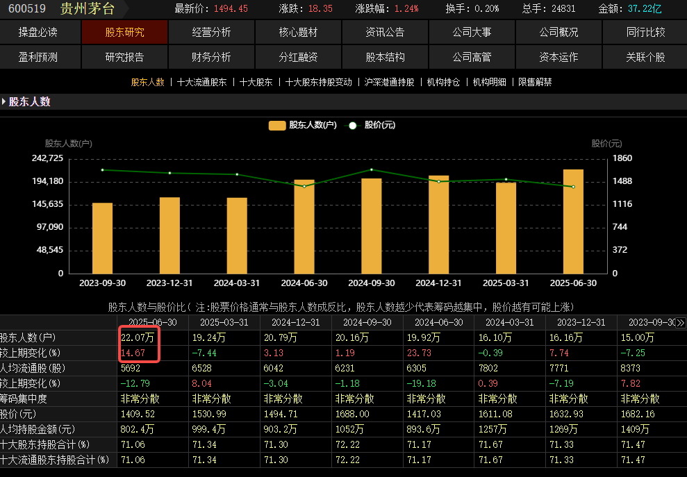 况且,目前主题新旧动能转换的过程中,投诚到AI主题阵营的多头势力规模,越来越庞大起来。资金流向的硬核数据,不会说谎。根据wind数据显示,截止2025年6月末,持有贵州茅台的基金家数为1662家,和一季度比,增加了400家,表面看上去,还可以。但综合其他数据,我们就会发现,实际上对该股持有强烈做多信心的机构投资者,声势早已不如鼎盛之时了。一方面,二季度持有茅台的券商,和一季度相比减少了一半以上。另一方面,持有其流通股的股东数量,和一季度相比增加了15%,成熟的投资者都知道,在股价调整趋势中,如果股东数量增加幅度较大,意味着筹码比较分散。恰好今年二季度茅台股价跌幅接近两位数,股东数量增加的话,足以代表暂时没有足够实力的大资金承接抛压,或者也可以解读为场外资金对公司的预期,相对不那么乐观。