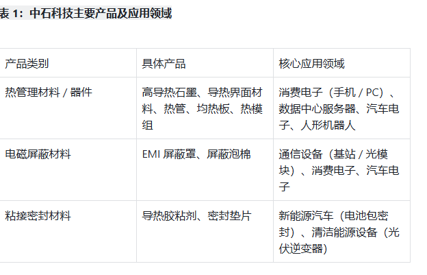 中石科技以“解决电子产品可靠性问题”为核心,构建了多元化的产品矩阵,涵盖热管理、电磁屏蔽、粘接密封三大领域,具体包括高导热石墨产品、导热界面材料、热管、均热板、热模组、EMI屏蔽材料、胶粘剂及密封材料等(表1)。公司产品具有显著的技术与工艺壁垒,例如高导热石墨产品的导热系数可达1500-2000W/(m・K),远超传统金属材料;热管/均热板采用微通道设计,散热效率较常规产品提升30%以上,能满足AI设备、数据中心服务器等高功率场景需求。