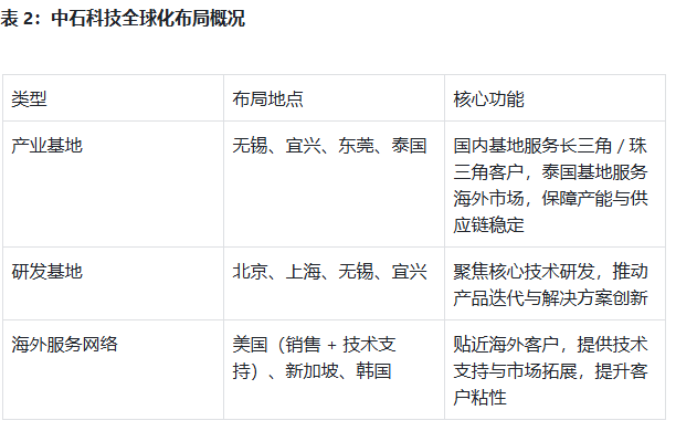 为支撑业务扩张与客户服务,中石科技构建了“多基地、全链条”的全球化布局,形成“产业基地+研发中心+海外服务网络”的协同体系。