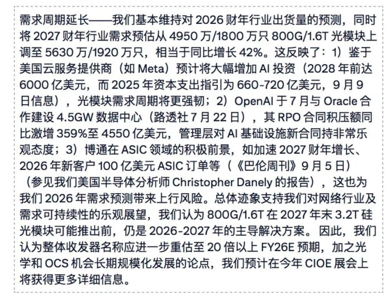花旗认为,市场此前普遍只看到2025年的成长,但实际上,需求曲线已经清晰延伸到2027年,到2027年,AI数据中心带来的光模块需求有望实现翻倍式增长。这一时间跨度远远超过一般电子元器件行业的预测周期,赋予了光模块企业极高的确定性。
