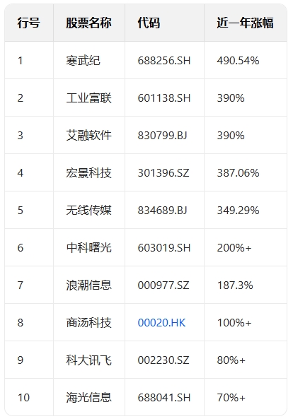 AI头部企业涨幅TOP10表格