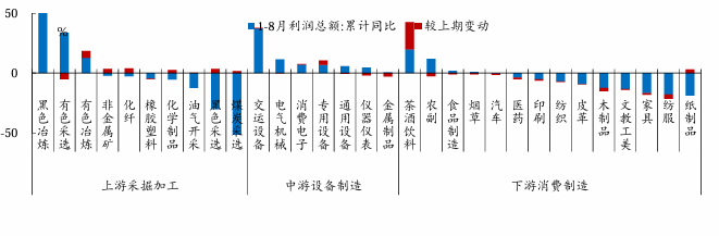 产业上中下游角度观察,也非常具有参考价值。像在今年8月份,受益于需求增速、价格回升等因素,上游利润明显改善。1-8月利润累计同比提高了3.8个百分点至-9.1%,其中黑色冶炼、黑色采选、有色冶炼、化纤等改善幅度较大。中游维持较高增速、对工企利润起到“压舱石”作用,其中专用设备、消费电子、交运设备较前值改善了3.7、0.5、0.5个百分点。下游消费制造由降转增,茶酒饮料贡献较大。
