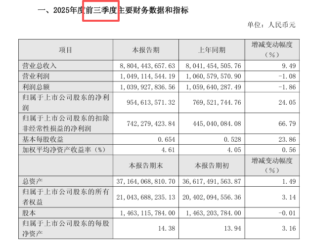 前三季度 :营业收入88.04亿元,同比增长9.49%;归母净利润9.55亿元,同比增长24.05%;扣非净利润7.42亿元,同比增长66.79%;基本每股收益0.654元,同比增长23.86%;加权平均ROE为4.61%,同比提升0.56个百分点。
