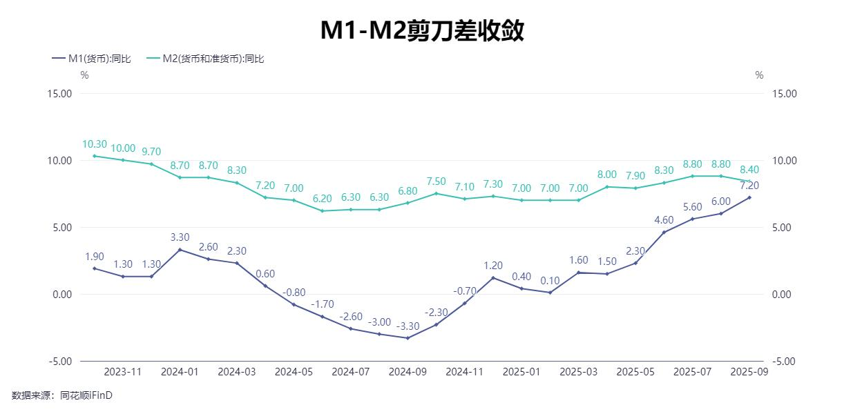 由于从货币层次看,M2涵盖各类存款,反映金融体系对实体经济的支持力度;而M1则以活期存款为主,直接代表企业生产经营与居民消费投资的“活钱”规模。因此,可以认为,剪刀差收窄本质是“资金活化”的体现,也就是说,当前企业与居民更愿意将定期存款转为活期,意味着资金从“沉淀状态”进入“交易状态”,经济循环效率正在提升。这种变化与前三季度30.09万亿元的社融增量形成呼应,显示金融对实体经济的支持正从“总量宽松”向“效率提升”转型。
