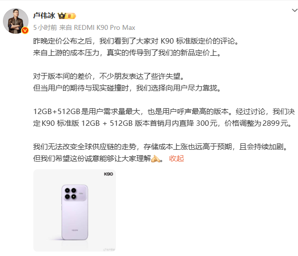而且,就连小米手机部总裁卢伟冰也发文表示,K90标准版的定价压力主要来自上游“存储成本暴涨”,实际传导已远超预期。