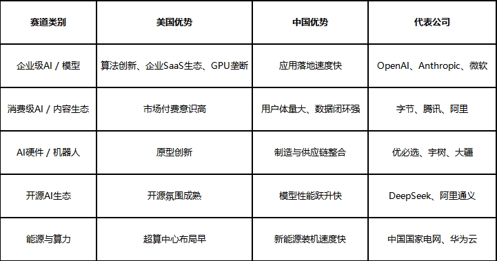 美国依旧主导科研创新和企业级AI,而中国则在机器人、AI硬件与能源基础设施上跑出自己的路线。