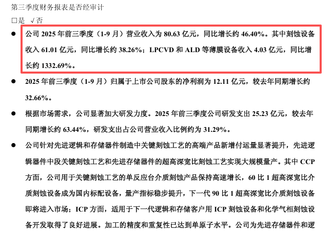 其中,刻蚀设备收入61.01亿元,同比增长38.26%,仍是营收核心;LPCVD与ALD薄膜设备收入4.03亿元,同比暴增1332.7%,成为新的增长极。
