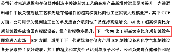 报告提到,公司用于关键刻蚀工艺的60比1超高深宽比介质刻蚀设备已成为国内标配,下一代90比1设备即将进入市场,加工精度和重复性已达到单原子级水平。