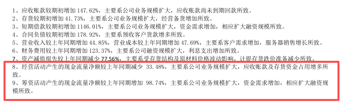 说到现金流,浪潮前三季度的经营活动产生的现金流净额为负 ,达-125.7亿元,同比下降33.48%。大家可能会担心,但这其实是浪潮扩产过程中的必然现象。原因在于: