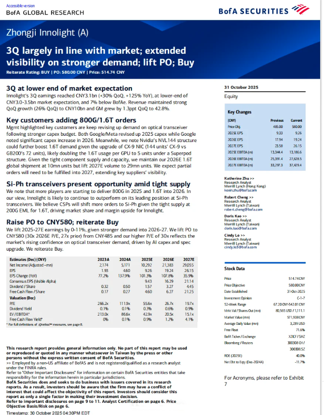中际旭创在2025年第三季度的业绩表现符合市场预期。美银指出,尽管公司当季净利润为31亿元人民币,同比增长了125%,但位于市场预期的下限,显示出短期内的稳健。然而,美银强调,未来的增长潜力才是投资者最应关注的焦点。