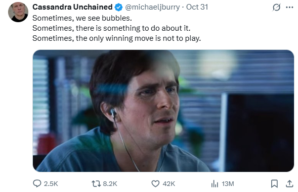 他在社交平台X上写道:“有时我们看到泡沫;有时唯一的胜利方法,就是不参与。”
