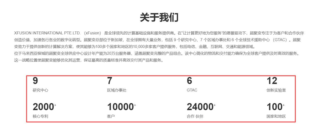 截至目前,超聚变在全球已设立9个研发中心、6个供应中心、6个全球技术服务中心、7大地区部 ,客户遍及100多个国家与地区,服务企业超过1万家。