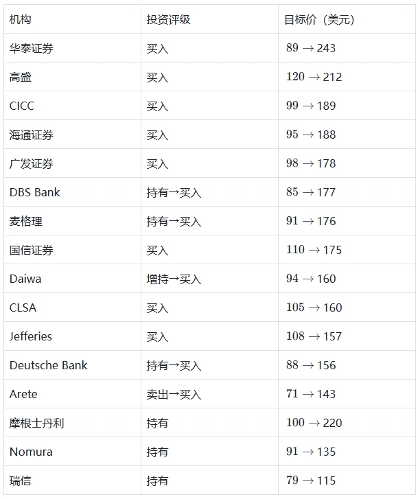 自 2025 年 9 月以来,高盛、摩根士丹利等二十余家机构均已上调百度评级和目标价(如下表所示)。